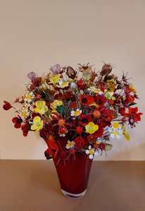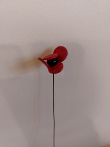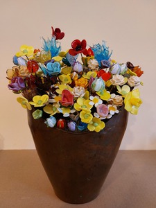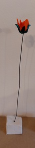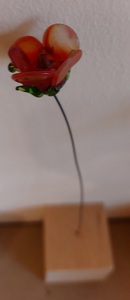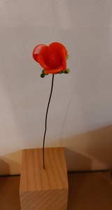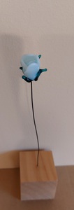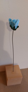 2026blauw roosje van glas met metalen staafje in houten blokje